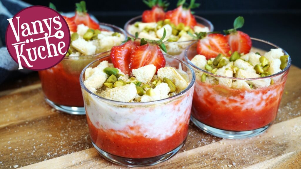 - Joghurt, Frischkäse, 1 TL Vanillepaste und 1 TL Zucker in den Mixtopf geben und 10 Sek./Stufe 4 mischen. Joghurtcreme auf den Erdbeeren verteilen und je 1 Löffelbiskuit darauf zerbröseln. Lauwarmes Rhabarberkompott darauf verteilen und je 1 Löffelbiskuit darüber zerbröseln. Mit je einer Erdbeere und gehackten Pistazien dekoriert servieren.